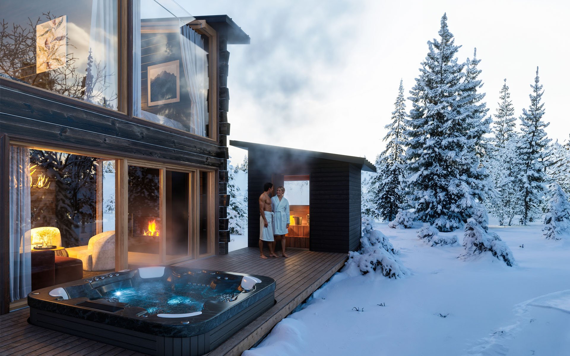 Guests enjoy a shared fireplace lounge, outdoor sauna and hot tub under the stars, private chef services on request, and panoramic balconies overlooking the surrounding wilderness.
